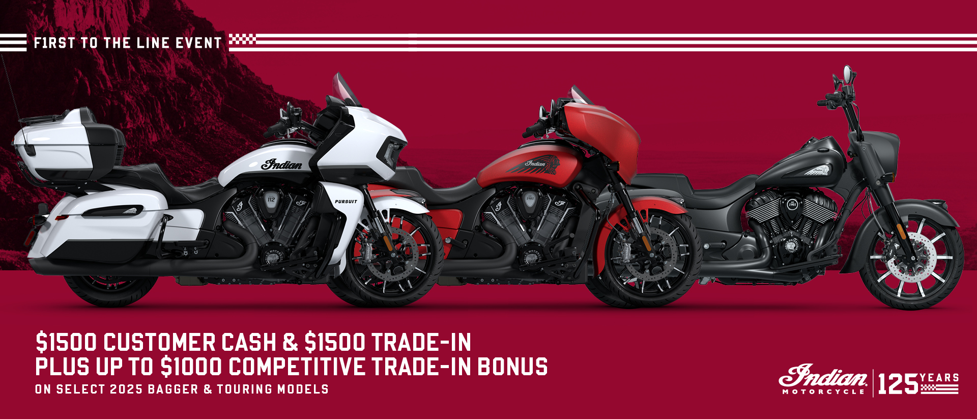 This is a limited time offer which consists of $1,500 Customer Cash rebate towards the purchase of new model year 2025 Chieftain PowerPlus, Roadmaster PowerPlus, Indian Challenger, Indian Pursuit, Chieftain, Roadmaster, or Indian Springfield models (excludes Elite models). This offer is subject to change and may be extended or terminated without further notice. Offer may be combined with valid Trade-In Credit offers, but may not be combined with promotional financing offers. All rebates paid to dealer and are not redeemable for cash. Offer Valid: March 1 – 31, 2026.
